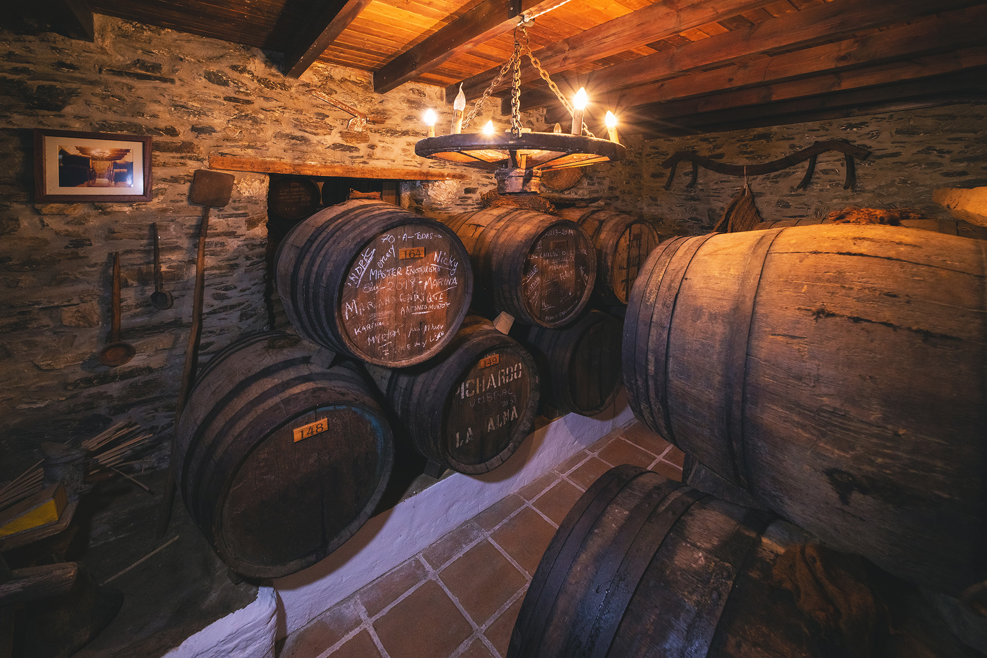 La bodega posee una belleza singular, cuidan hasta el más mínimo detalle, algo que podemos apreciar adentrándonos en las diferentes salas que forman la bodega. La disposición de los barriles en el espacio, la iluminación cálida y envolvente con lámparas artesanáles hechas con cepas de vid…